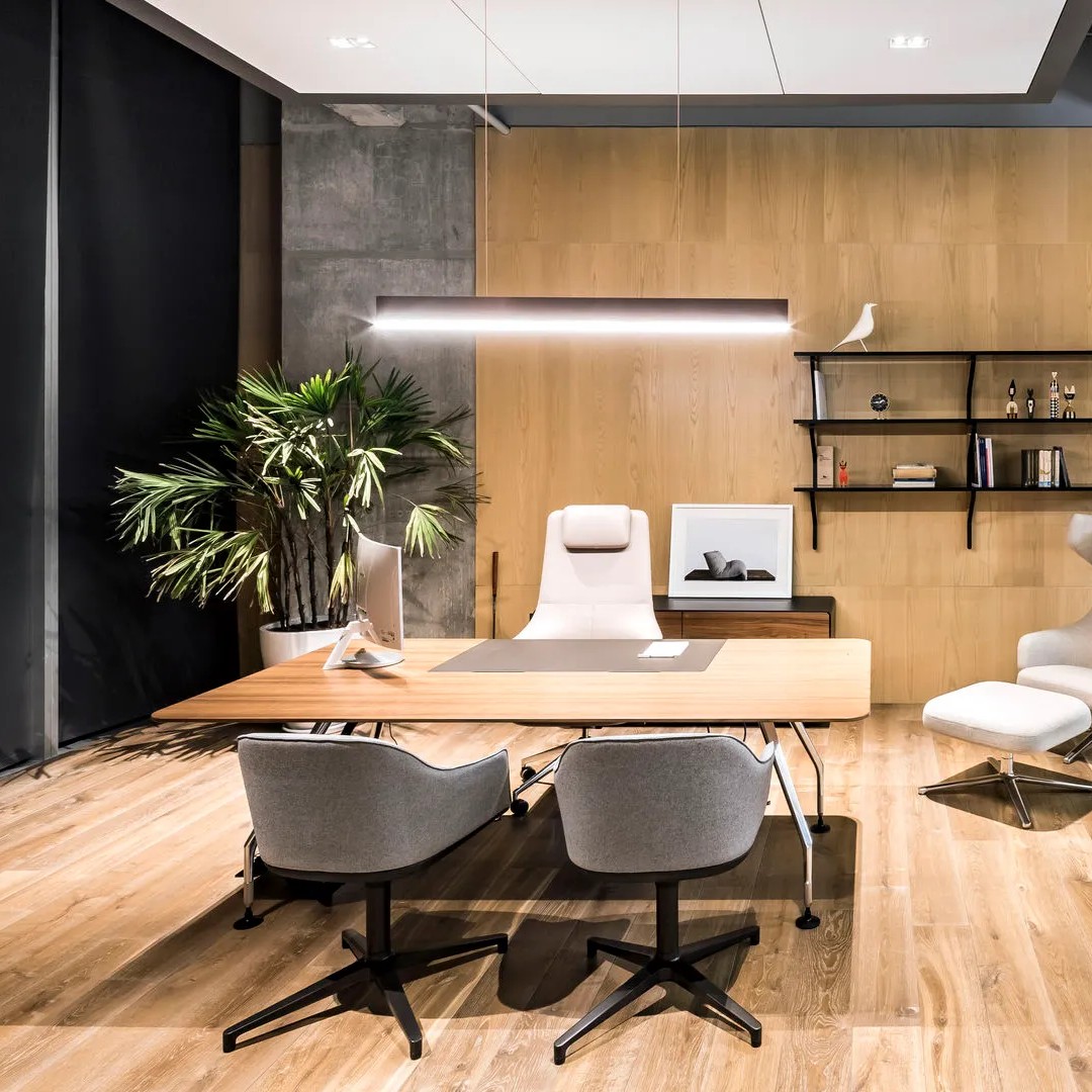 • Lignes fluides et équilibrées qui valorisent tous les espaces professionnels, du bureau exécutif aux environnements collaboratifs.