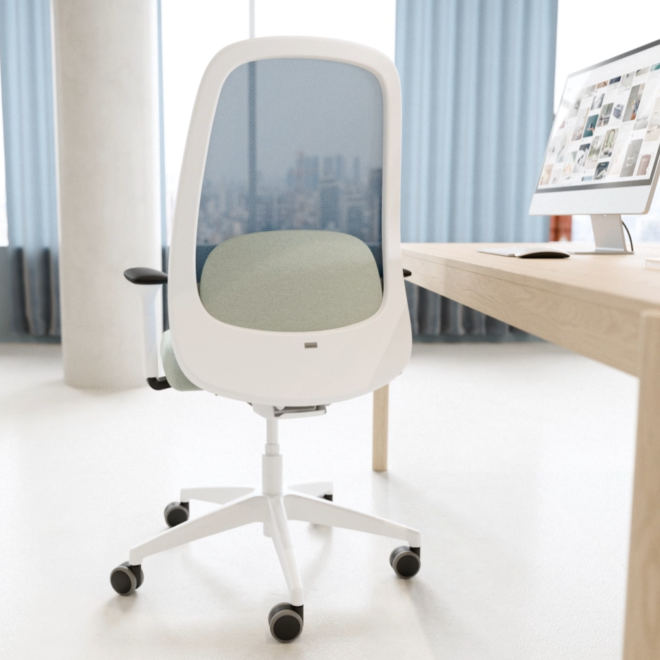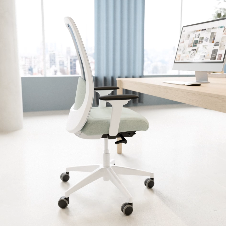 Beschikbaar in een reeks netkleuren en stoelbekledingen, kan hij worden aangepast aan de visuele identiteit van een ruimte zonder afbreuk te doen aan de ergonomische prestaties.