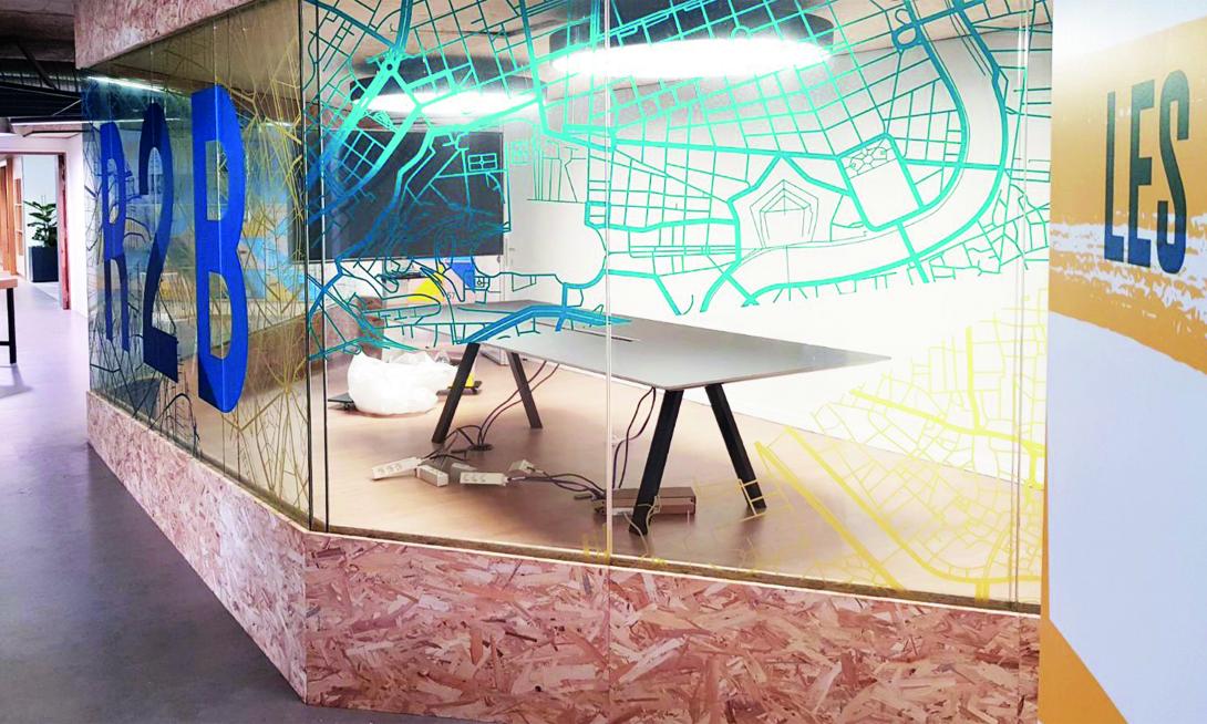 Pour que vous vous sentiez complètement chez vous, il est parfois possible que vous nous demandiez de poser un stickers sur une vitre, un mur ou encore sur du mobilier. Nous aimons laisser au client le plaisir de s’approprier les lieux.. Chez WOOH, il existe un large choix de stickers, qui se mettent généralement sur cloison de verre quand il s’agit de sablage, de film coloré ou encore de lettrage.