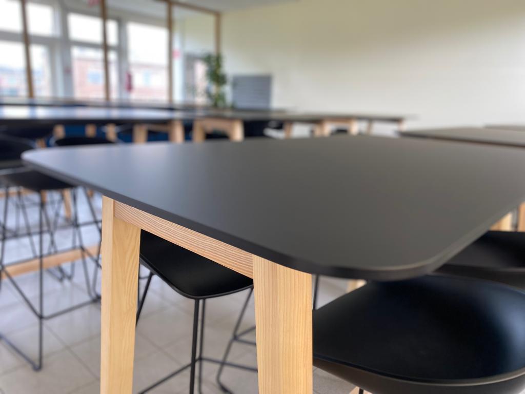Les tables sont des Nova Wood, pieds bois et top phénix noir. Les tabourets aux pieds métal et avec une coque noire en polypropylène sont de la marque Narbutas. Le polypropylène est le matériau de prédilection dans ce type d’usage. Facile d’entretien, résistant à l’usure et déclinable dans de nombreuses couleur, ce sont ces critères que l’on cherche lors d’aménagement de cafétéria ou de réfectoire.