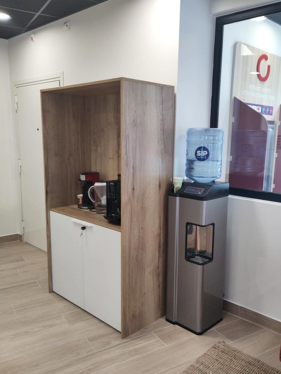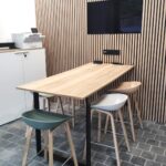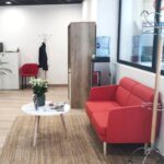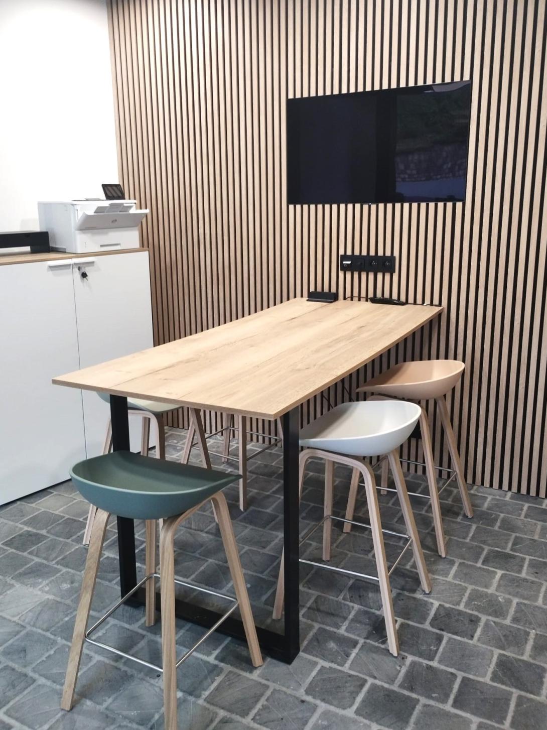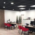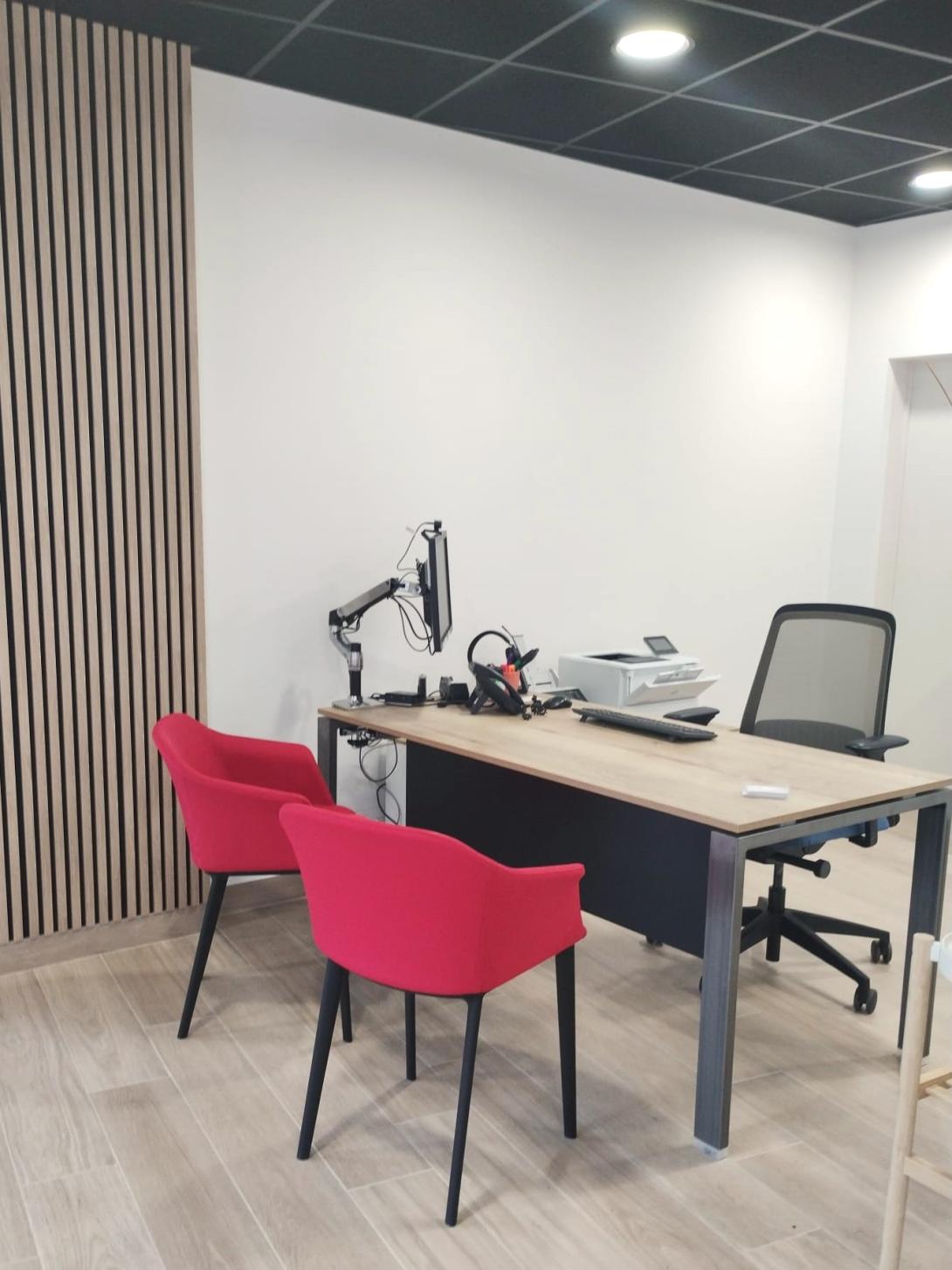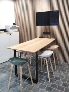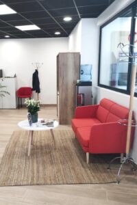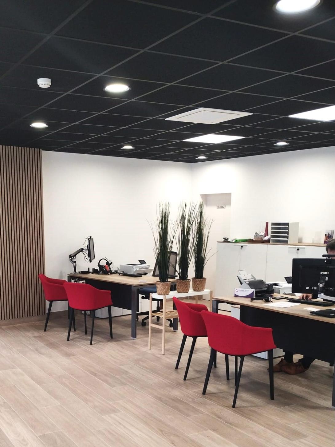 Les pièces concernées étaient l’espace d’accueil, l’open space, le coffee corner et une salle de réunion. L’ambiance générale se veut chaleureuse, sobre et épurée, avec quelques touches de rouge pour rappeler le logo. On retrouve donc une majorité de blanc et de bois au niveau du mobilier, mais également au niveau du bardage en bois mural et du claustra à l’accueil qui permet de créer un brise-vue par rapport au bureau. Le piètement des bureaux est noir afin de donner du caractère aux espaces de travail. Quelques touches de rouge et de vert sont apportées par le tissu des assises et par les tabourets disposés dans la salle de réunion.