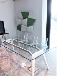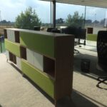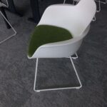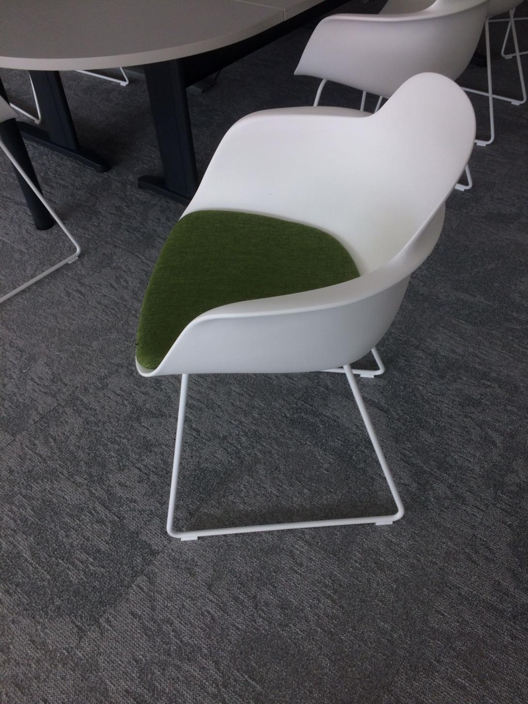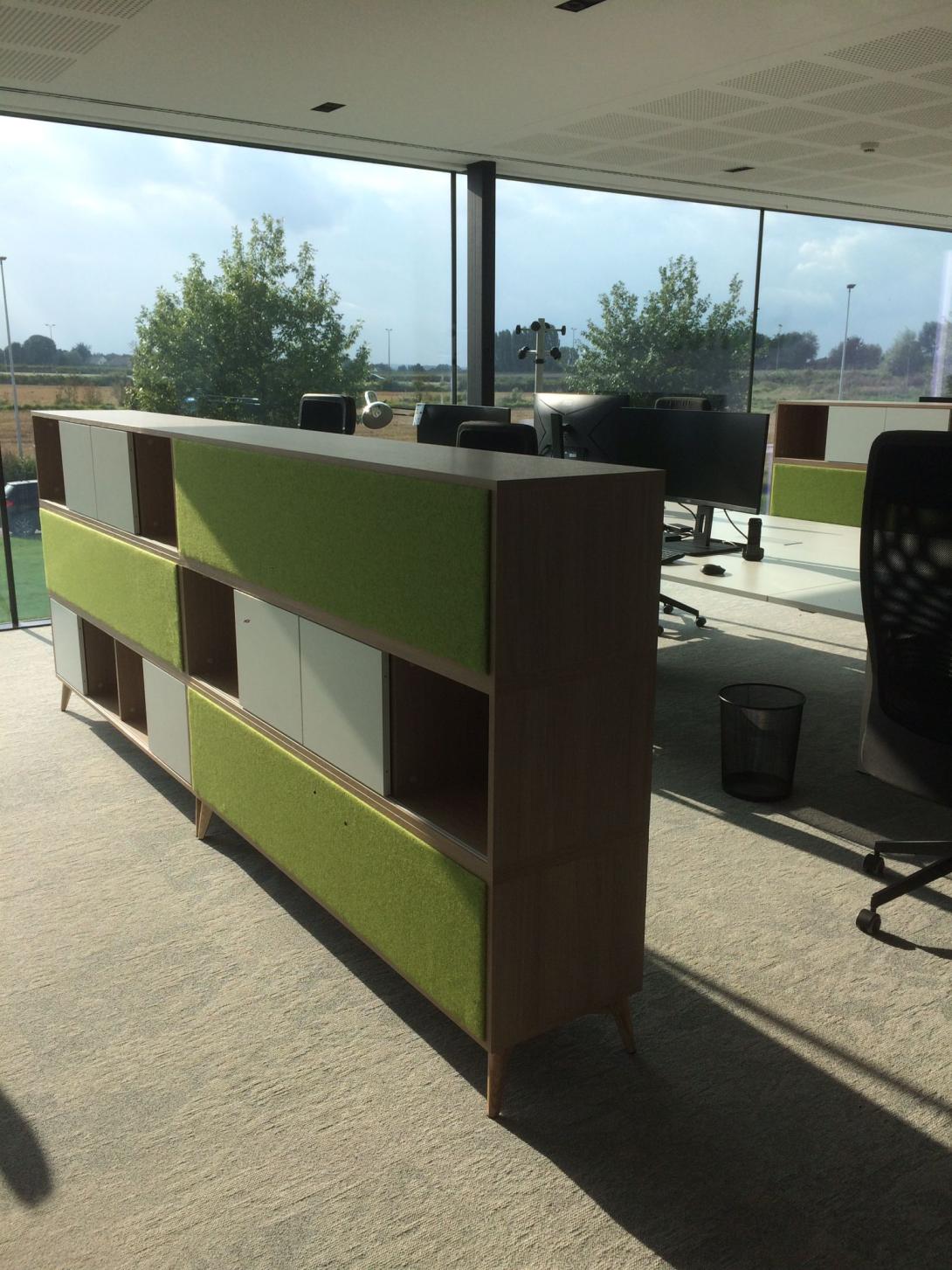 L’ensemble du mobilier est principalement blanc et vert pour rappeler le logo de la marque. Poufs, panneaux acoustiques, galette pour les chaises, tissus au dos des armoires de rangements, autant de touches de couleurs vertes pour dynamiser l’espace et créer un fil conducteur sans alourdir.