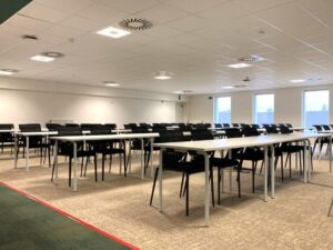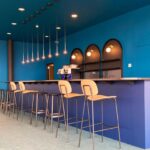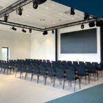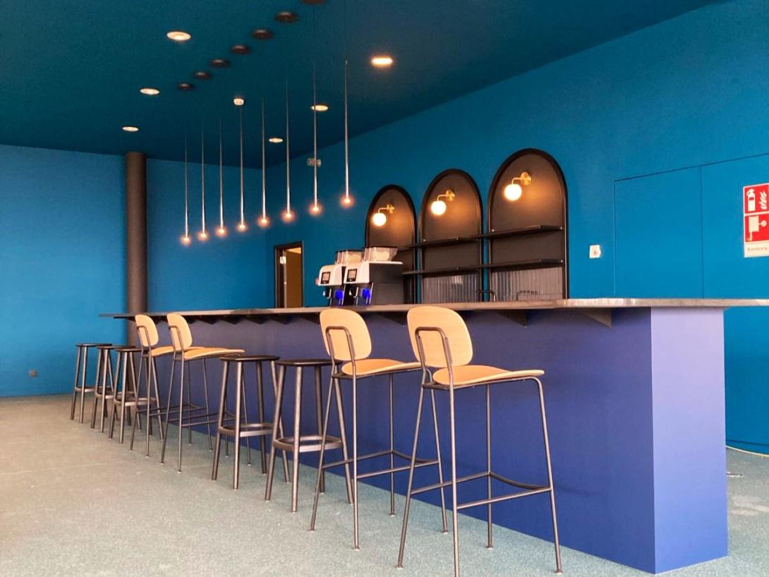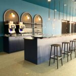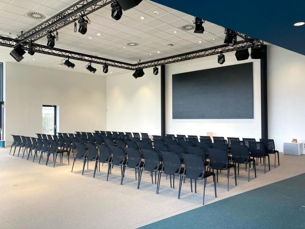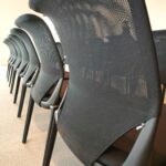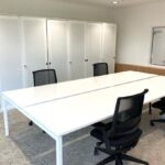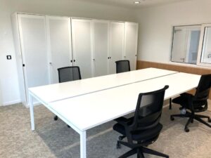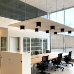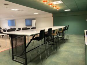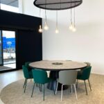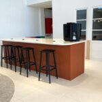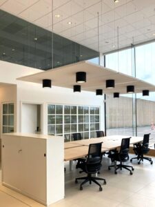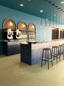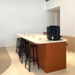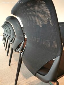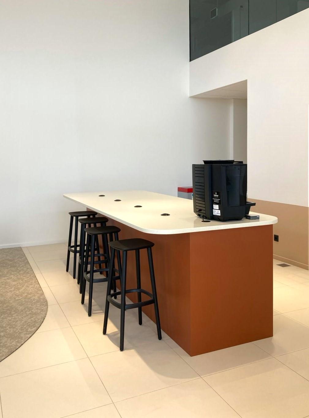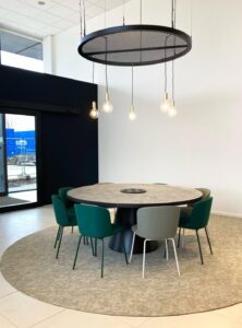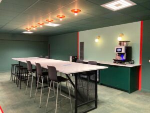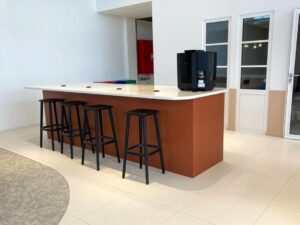 Les pièces concernées étaient des espaces cafétarias, des salles de conférence, des bureaux et des espaces de réunions informelles. L’ambiance générale se veut industrielle, chaleureuse et dynamique par les touches de couleurs. On retrouve essentiellement l’aspect industriel par les différentes chaises et tabourets qui sont noir (résille, tissu, bois, etc) : les tabourets hauts Babila de chez Infiniti, chaises visiteur Medaslim de chez Vitra ou encore les chaises de bureau ergonomiques Movy de la marque Intersthul.