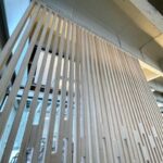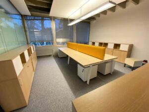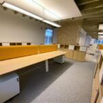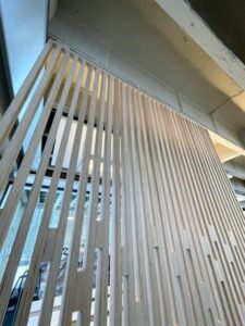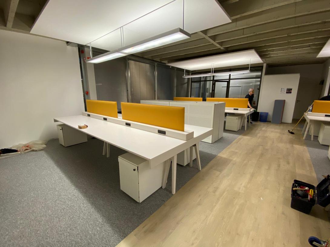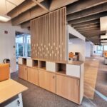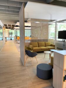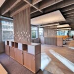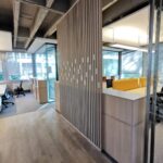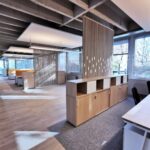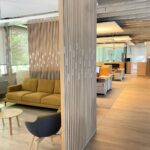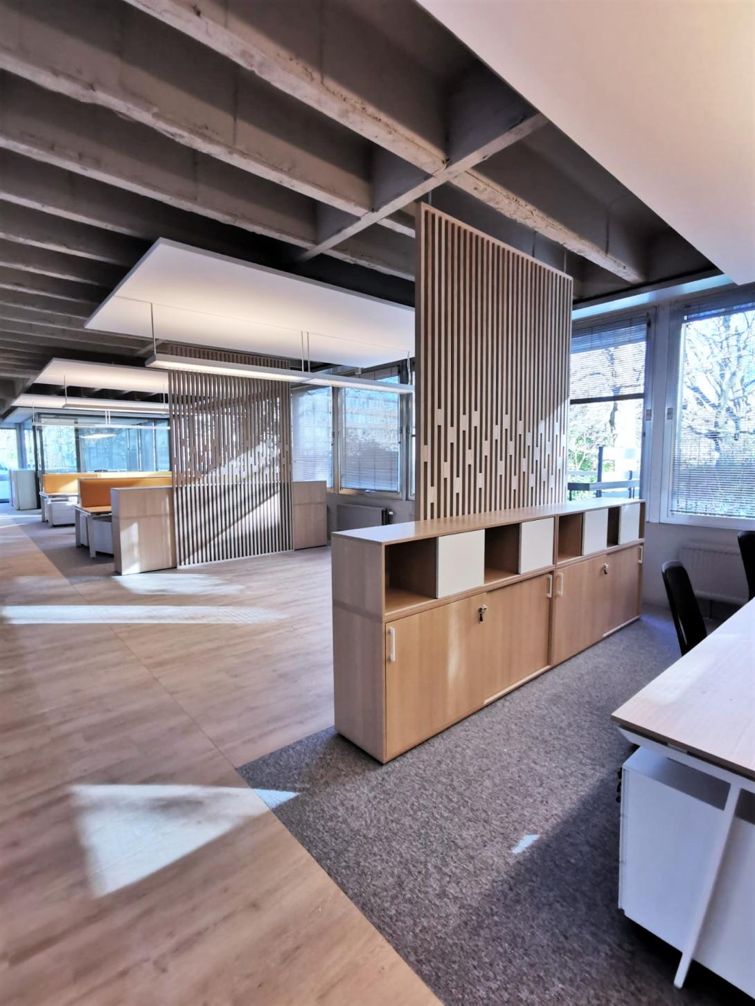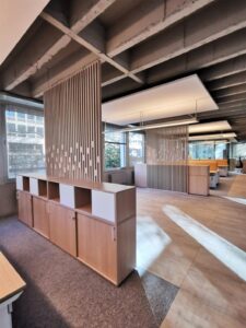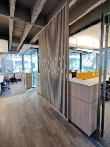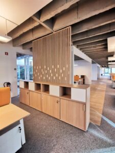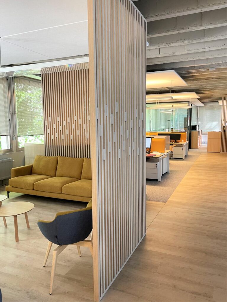 Pour souligner les espaces : des claustras en multiplex surfacé chêne ont été placés. Ils sont réalisés et placés par notre équipe de menuisiers. Ils apportent de la chaleur, du dynamisme et intimise les zones de travail.