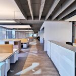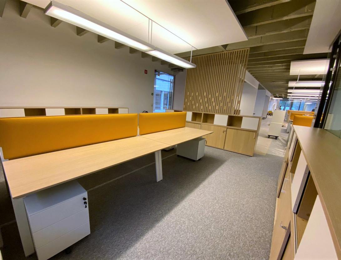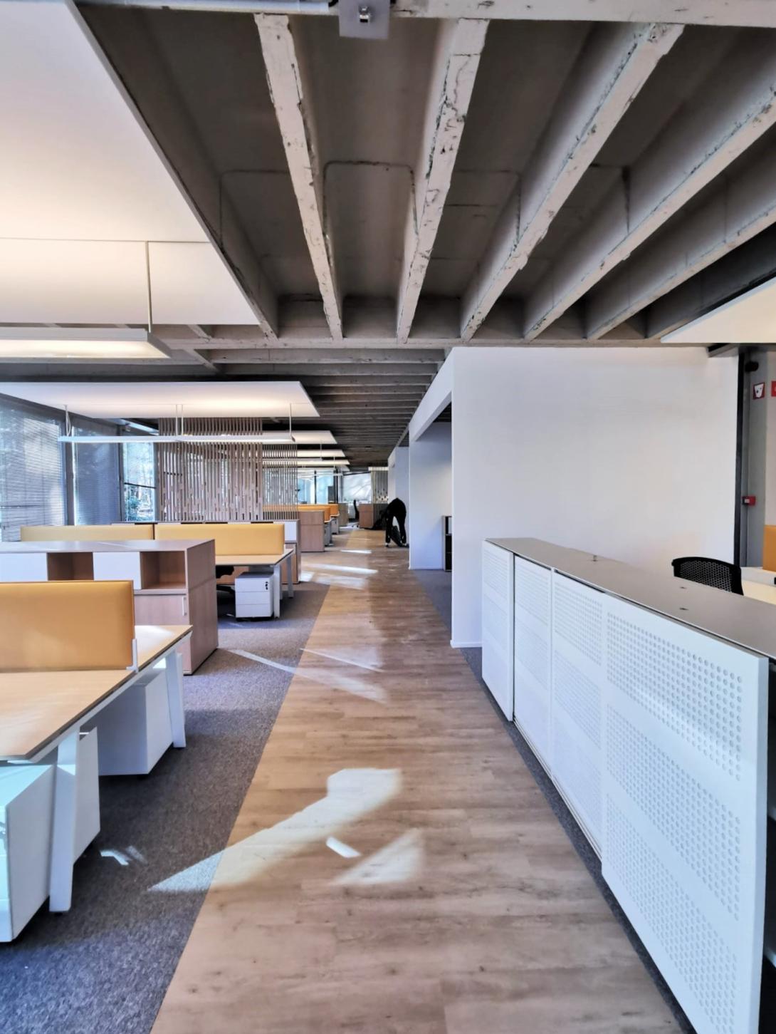 L’acoustique et la luminosité n’ont pas été négligés dans cet espace ouvert : suspensions LED rétro éclairés et plaques acoustiques Rockfon créent un ensemble harmonieux avec la structure béton des années 70 du bâtiment.