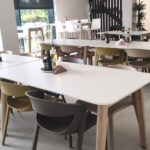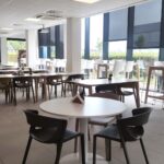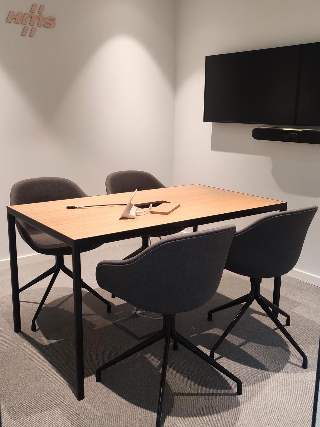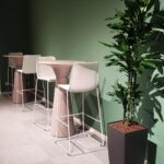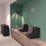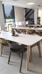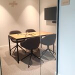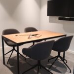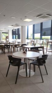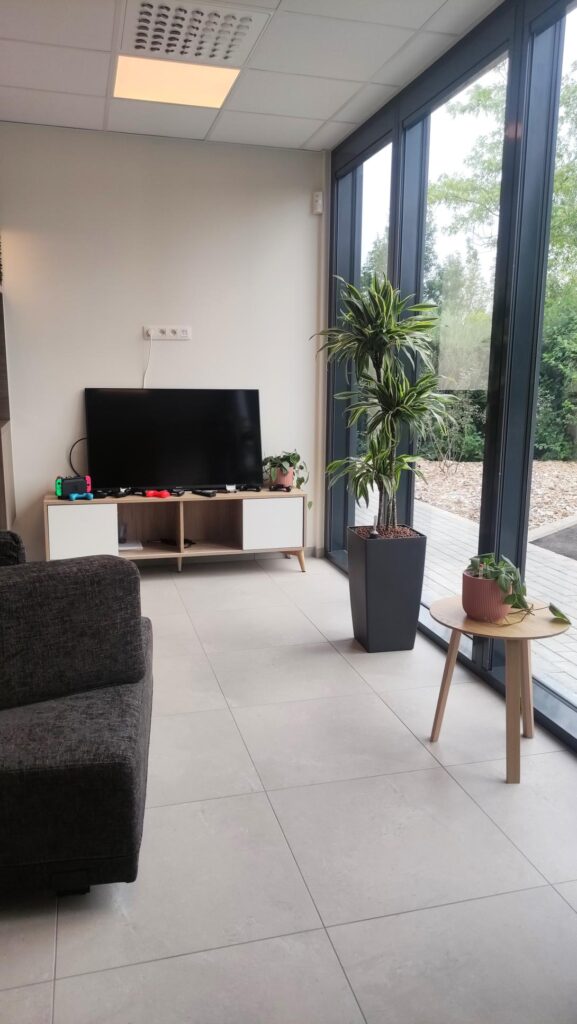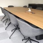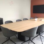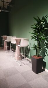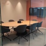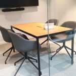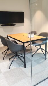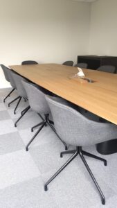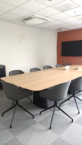 Les pièces concernées étaient la cafétaria avec des tables hautes et basses accompagnées de chaises Wilkhahn colorées. Le coin détente avec un meuble TV et une table d’appoint. Les bureaux ont été équipés de bureaux électriques avec caissons sur roulettes, armoires, chaises ergonomiques et un petit coin réunion pour 3-4 personnes. Pour les bubbles, nous avons fourni un ensemble table haute et support écran ainsi que les tabourets hauts. Le mobilier vient essentiellement de la marque Narbutas. Concernant les salles de réunions, nous avons fourni uniquement les chaises, il s’agit de la gamme AAC de la marque HAY.