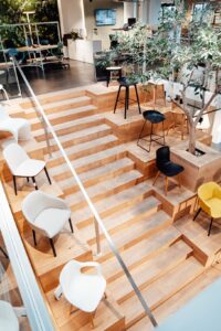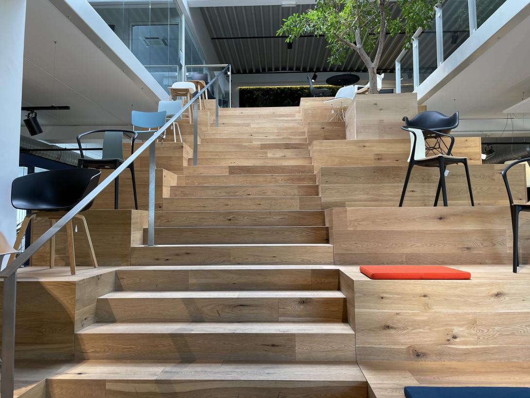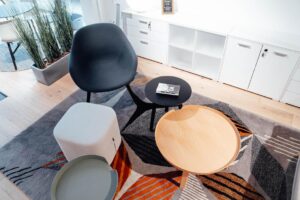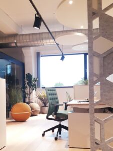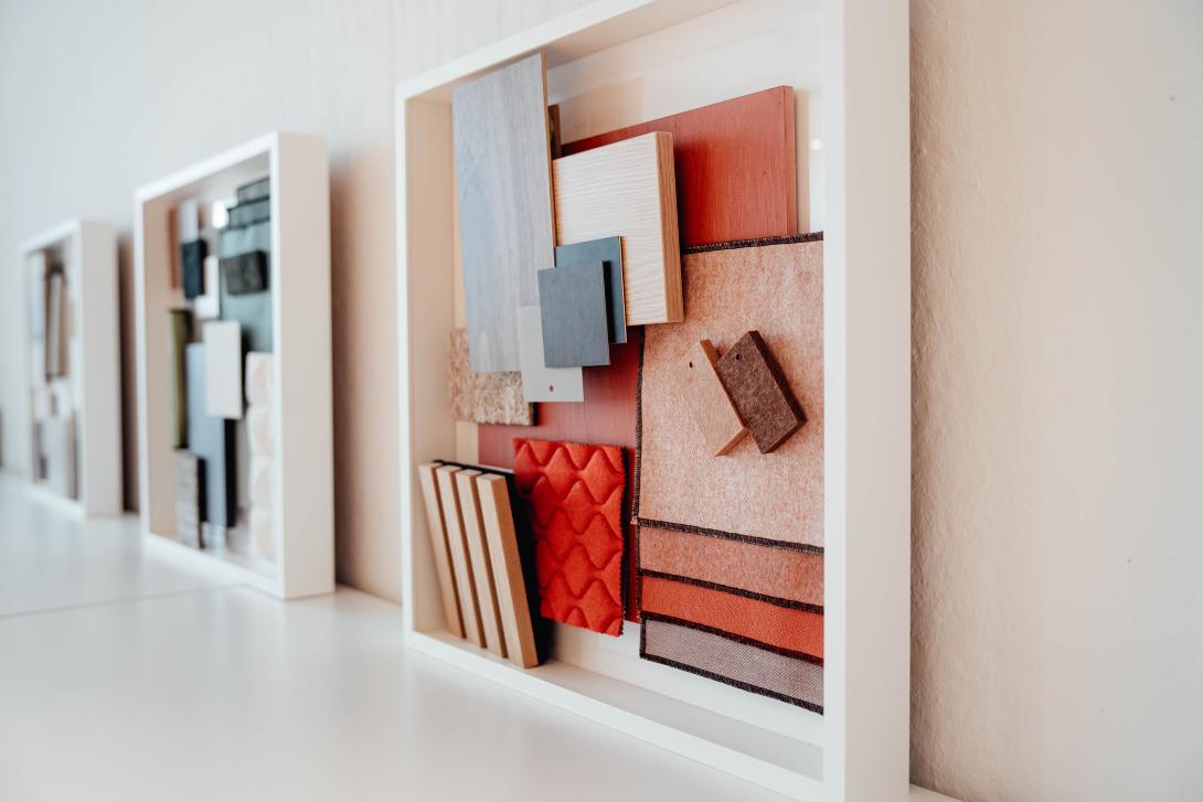 Mais également, grâce à l’extension du bâtiment réalisée en 2020, l’échantillonnage du secteur parachèvement a pu prendre place : tapis, mélamine, plancher, stores, claustra sont mis en situation et deviennent sources d’inspiration pour votre projet.