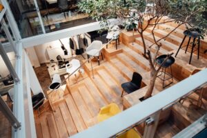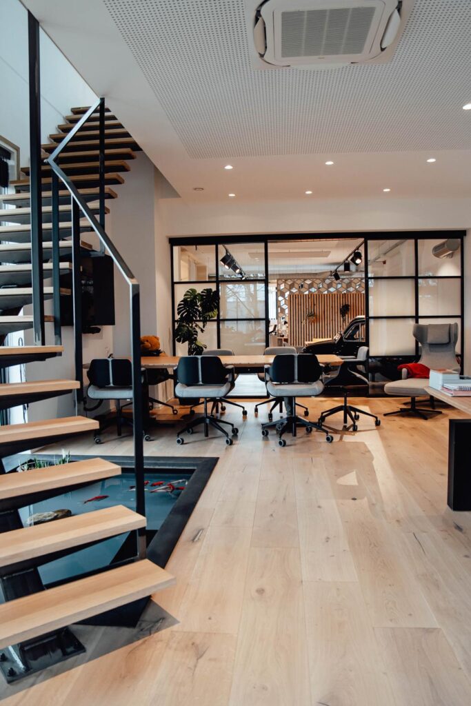 Le showroom n’est pas qu’un espace d’exposition, différentes entités y ont pris place : bureau d’étude en architecture d’intérieur, pôle logistique et, cachés en arrière-zone, le stock qui abrite vos commandes de mobilier et l’atelier de menuiserie.