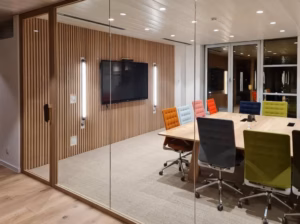 CC Lex – Aménagement d’un espace juridique : mobilier sur mesure, acoustique maîtrisée et atmosphère élégante pour un cadre de travail structuré et confidentiel.